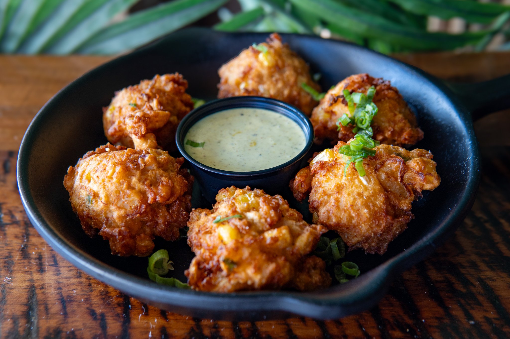 Lump crabmeat, sweet corn, jalapeño, and onion, fried golden brown in a hushpuppy-style fritter. Served with jalapeño-lime remoulade and scallions.