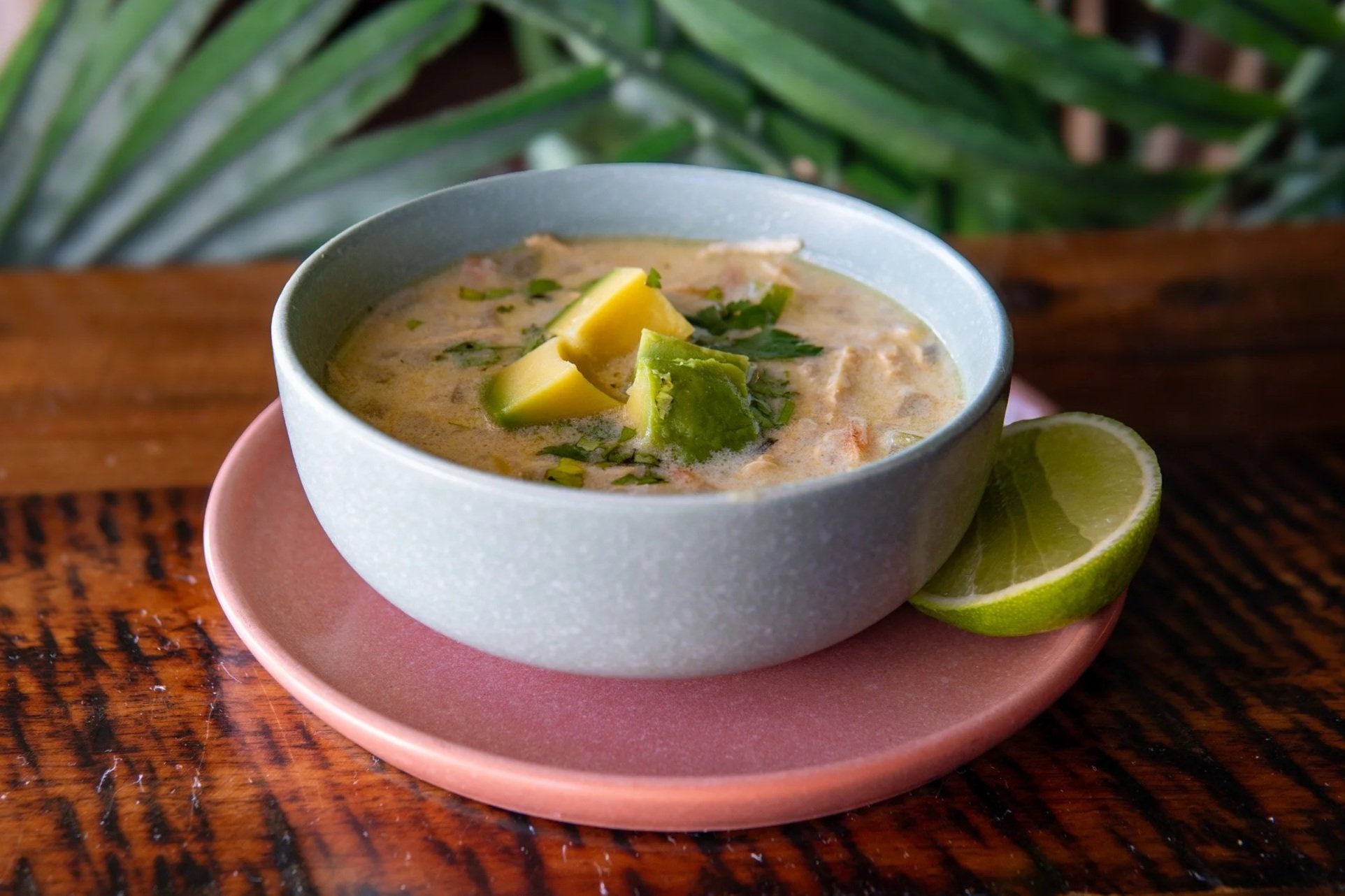 Shredded chicken breast and jasmine rice in a zesty chicken broth with a touch of cream, garnished with fresh avocado, cilantro, and lime.